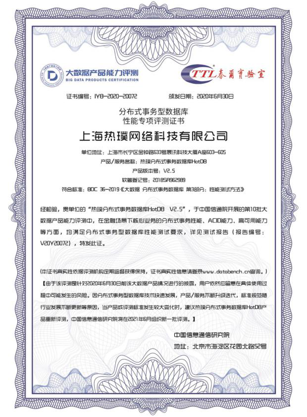 国产基础软件分布式事务数据库产品HotDB,历经十余年打磨,凭借产品硬实力成为业内仅四家厂商中的其中一家首批通过信通院金融数据库性能测评。热璞HotDB产品以优异的性能表现、完美的测评结果获颁“中国信通院第十批大数据产品能力评测”认证证书。