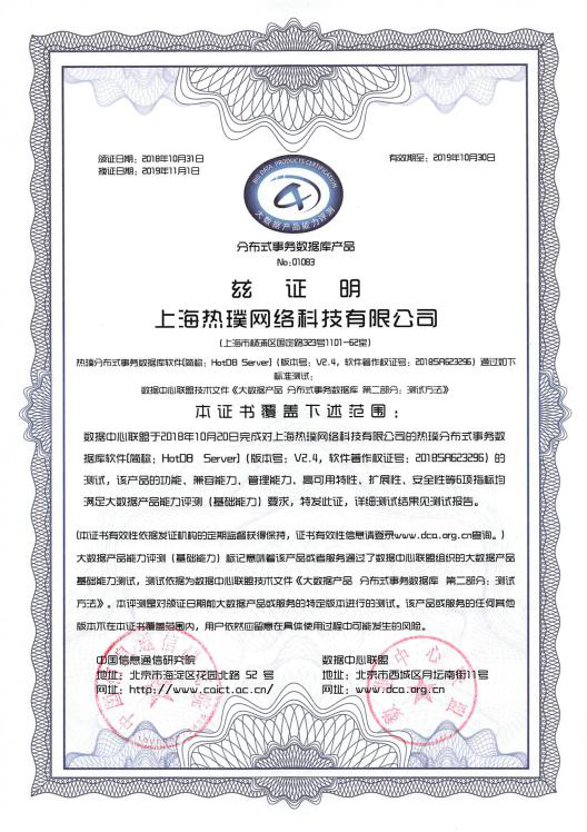 早在2018年,热璞分布式事务数据库产品HotDB Server就以在产品功能,兼容能力,管理能力,高可用能力,扩展能力和安全能力等六项指标测试中的突出表现,荣获DCA第七批大数据产品能力认证。