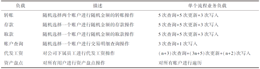 3、在业务交易完成后,在tranlog表中插入一条记录,记录交易日志。由于行业的特殊性,整个业务流程中不会涉及数据库的删除操作,所有的业务均是由查询、插入和更新组成的混合负载(见表1)。其中,资产盘点由于遍历全表的特性,只在所有其他业务结束后单独运行一次,用于模拟金融核心系统的跑批功能。其他5种业务组成混合负载对数据库性能进行测试。
