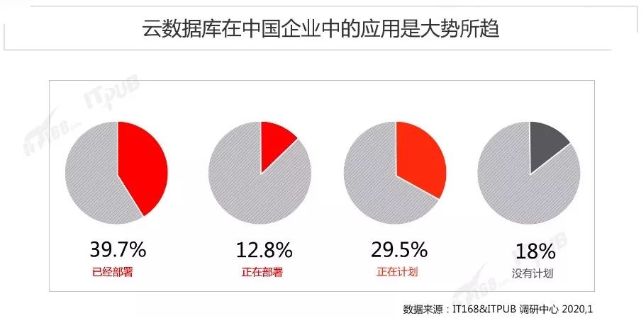在调研中,我们首先对中国企业的云数据库应用情况做了调查,从下图中,我们看到,82%的企业表示,已经部署或正在计划部署云数据库,其中已经部署、正在部署、正在计划部署的企业分别占39.7%、12.8%、29.5%,只有18%的企业表示没有任何计划。这说明,云数据库在中国企业中的应用是大势所趋。