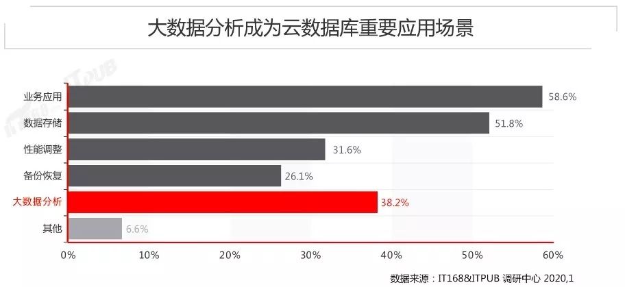 在企业的云数据库环境部署中,有58.6%的云数据库被用于实时的在线业务系统,而大数据分析正在成为云数据库重要的应用场景,占比38.2%,这说明企业已经从简单的业务数据处理阶段上升到更高的层次,越来越多的企业开始通过数据仓库的构建,BI,深层次的数据挖掘来进一步获取数据价值, 2020年,或将是数据资源向数据资产价值转化的关键期。