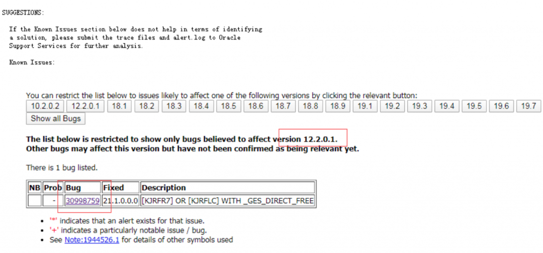 看不到更多有用的信息,本萎专家的第一感觉告诉自己,娘希匹的触发BUG了吧。登陆MOS查看有无堆栈信息类似的BUG,一搜真有发现,ID 406804.1中显示在12.2.0.1版本中有: