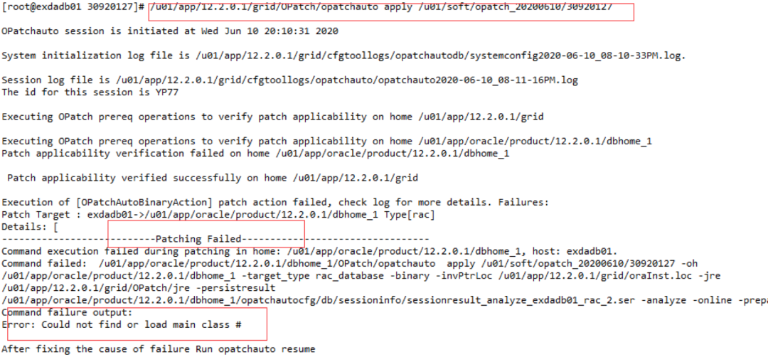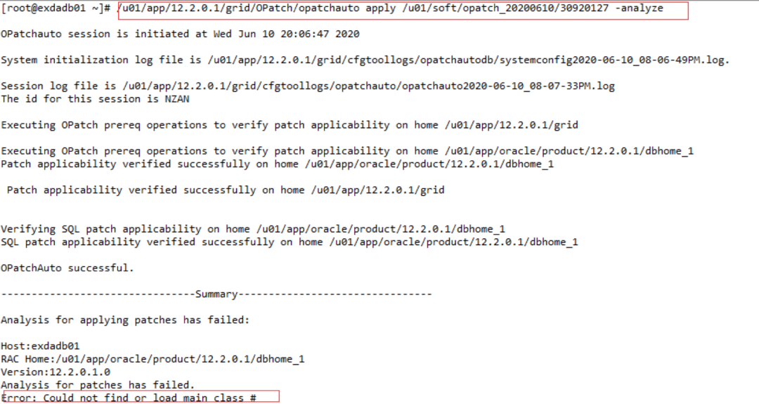 一、十万手速的查看日志,发现最开始做补丁冲突分析时就已经报Error: Could not find or load main class,显示在DB HOME做分析时就已失败: