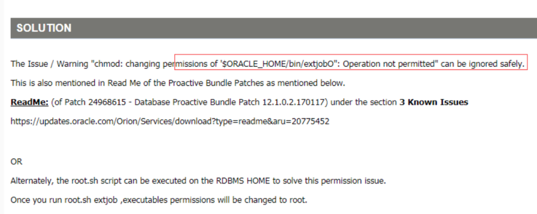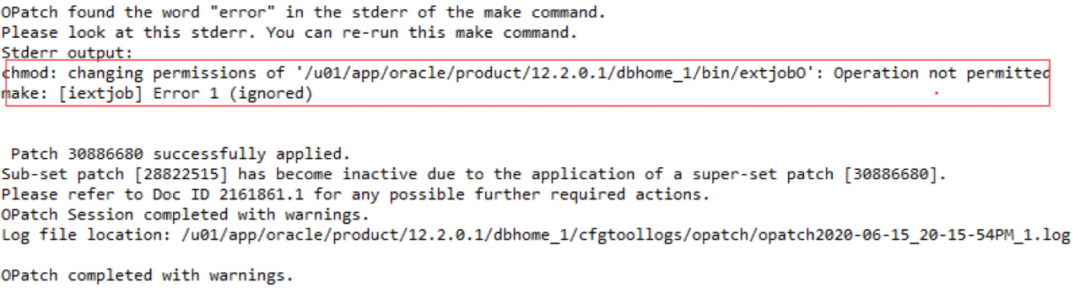 通过报错日志我们发现/u01/app/oracle/product/12.2.0.1/dbhome_1/bin/extjobO文件chmod失败。MOS了一下,ID 2265726.1介绍该报错可忽略