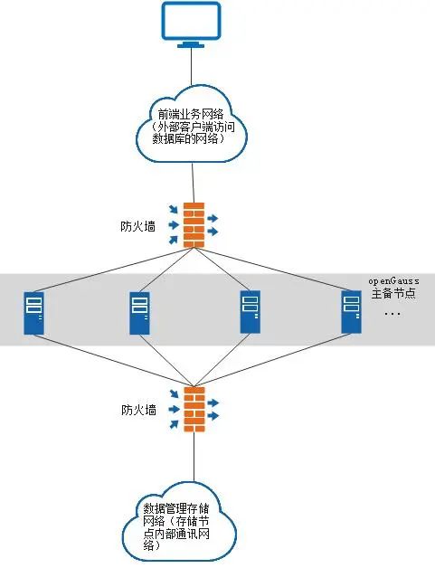 为了保证整个应用数据的安全性,建议将openGauss的典型组网划分为两个独立网络:前端业务网络和数据管理存储网络。