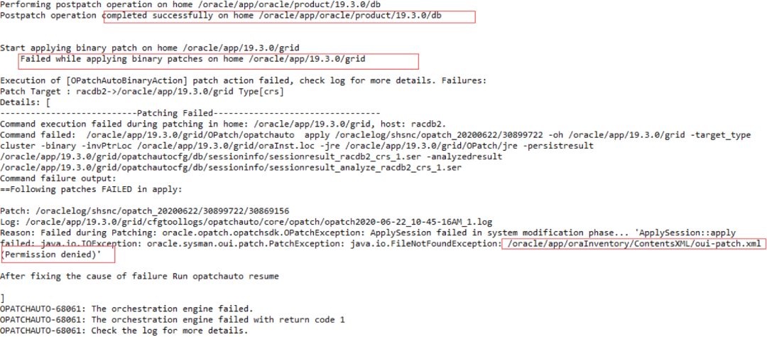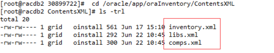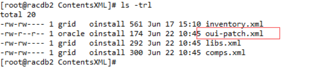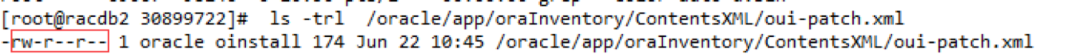 从以上截图我们可以看到补丁在DB HOME已经成功应用,但是在GI HOME应用时失败,报/oracle/app/oraInventory/ContentsXML/oui-patch.xml文件权限问题。我们查看文件权限发现问题所在,同组grid用户该文件无写权限