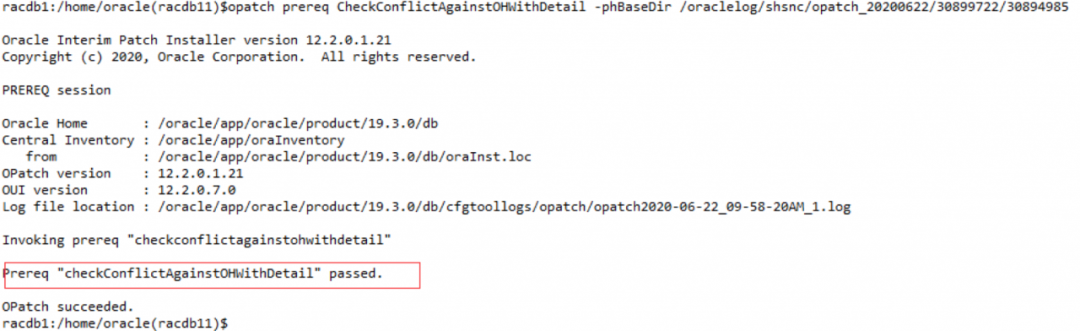 opatch prereq CheckConflictAgainstOHWithDetail -phBaseDir oraclelog/pa/opatch_20200622/30899722/30894985