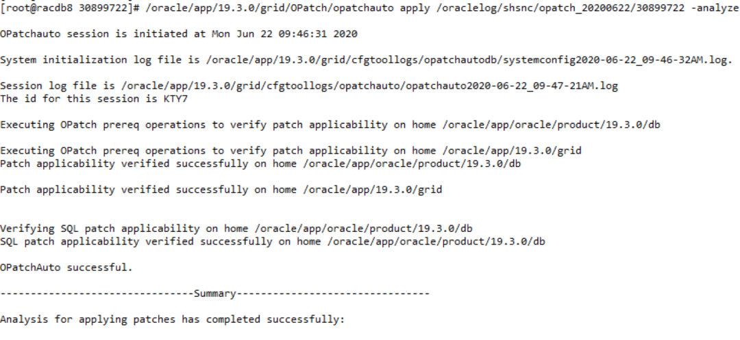 /oracle/app/19.3.0/grid/OPatch/opatchauto apply oraclelog/pa/opatch_20200622/30899722 -analyze