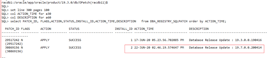 select PATCH_ID, FLAGS,ACTION,STATUS,INSTALL_ID,ACTION_TIME,DESCRIPTION from DBA_REGISTRY_SQLPATCH order by ACTION_TIME;
