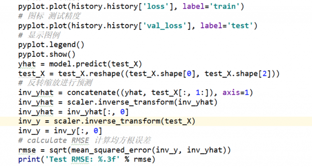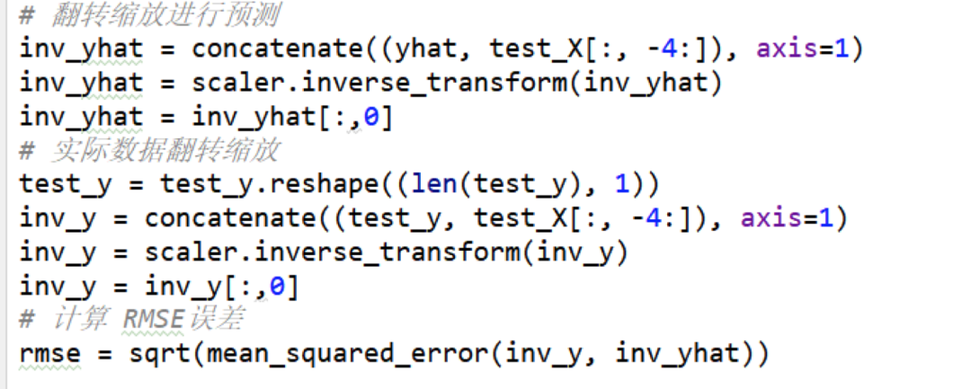 其他变化是如何评估模型那?具体来说,在我们如何重构具有5列的行的过程中,这些行适合于反转缩放操作以将y和yhat还原为原始比例,以便于我们计算RMSE。