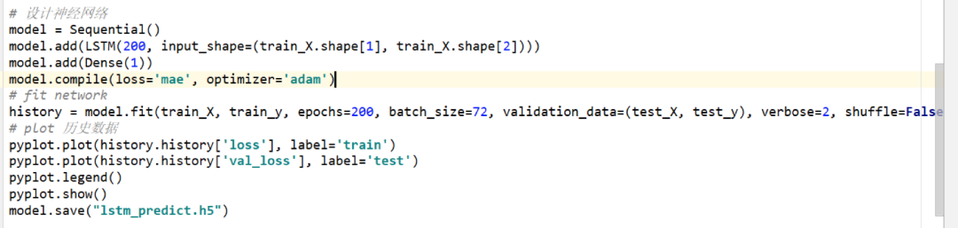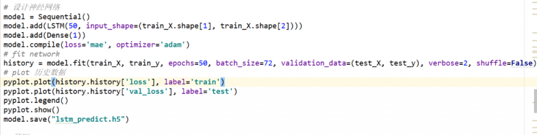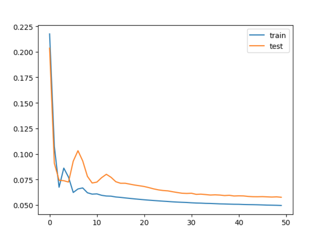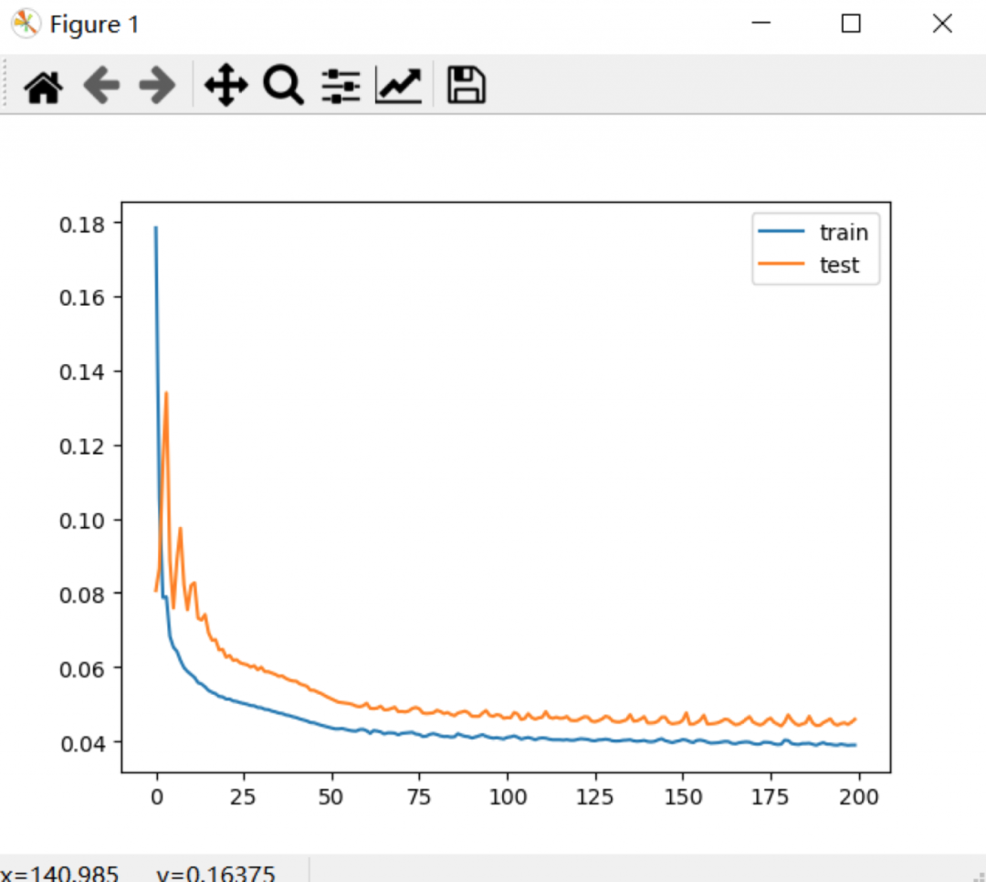 我们在第一隐藏层中定义50个神经元,在输出层中定义1个神经元来定义LSTM,以预测主机健康度。输入形状为1个时间步长,具有5个特征。我们使用平均绝对误差(MAE)损失函数和随机梯度下降的有效Adam版本。该模型将适合于50个训练周期,每批次的数量为72。请记住,每批结束时都会重置Keras中LSTM的内部权重,因此,内部状态可能是几天的函数,尝试对此进行测试,有助于模型的成熟度完善。最后,我们通过在fit()函数中设置validate_data参数来跟踪训练过程中的训练和测试损失。在运行结束时,绘制训练损失和测试损失。