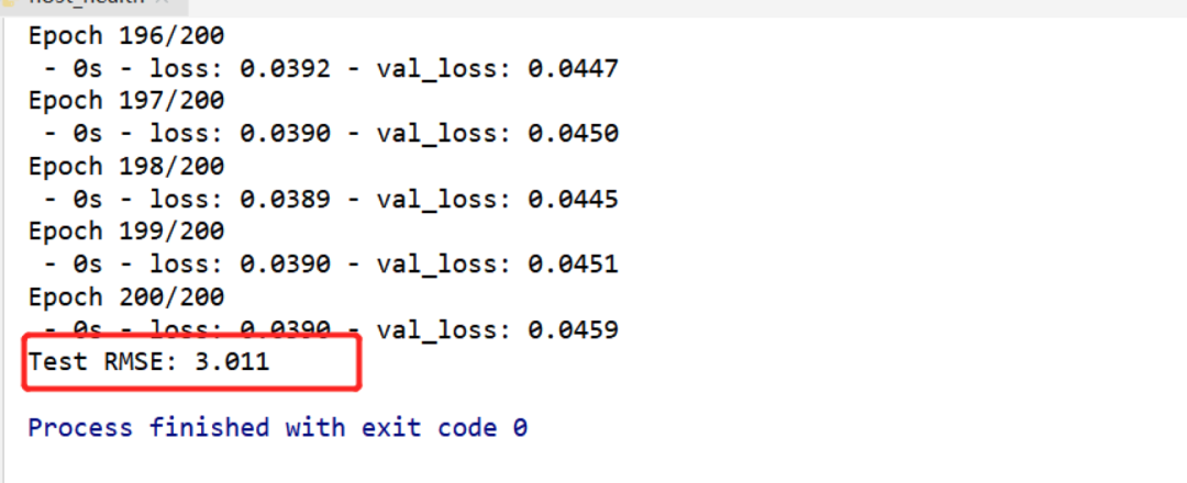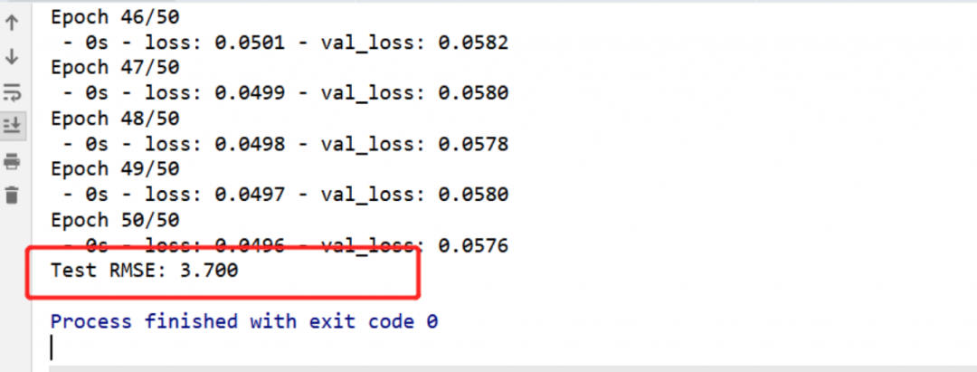 我们需要对此模型进行进一步优化。训练和测试损失在每个训练时期的末尾打印,以便于我们知道模型数据。运行结束时,将打印测试数据集上模型的最终RMSE。我们可以看到,该模型实现的RMSE 3.700
