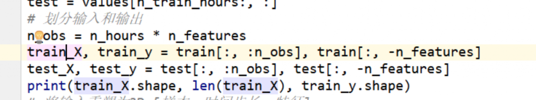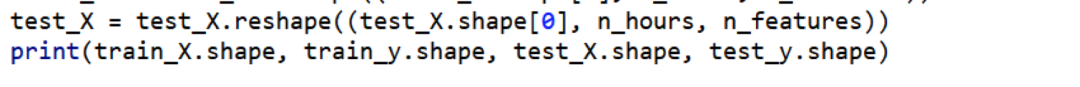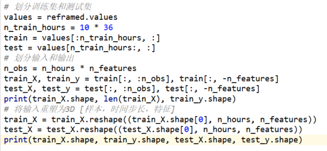 下面的示例将数据集分为训练集和测试集,然后将训练集和测试集分为输入和输出变量。最后,将输入(X)整形为LSTM期望的3D格式,即[样本,时间步长,特征]。