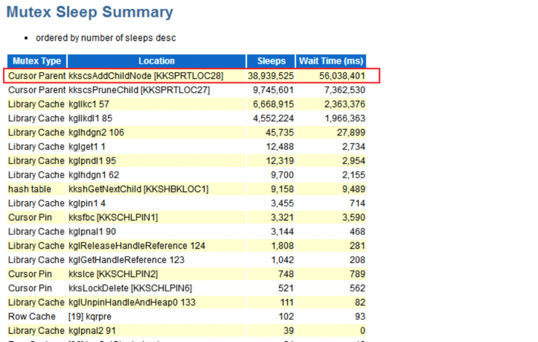 进一步分析,从Mutex Sleep Summary显示,耗时发生在增加子游标时,增加子游标需要对父游标加独占锁。Cursor Mutex X主要作用对于父游标的操作,增加子游标虽然更高效,但一个父游标下不宜增加太多的子游标,因为子游标会对父游标产生独占锁。此次问题出现909个子游标,所以重点排查为什么出现子游标,且子游标没有被共享的原因。