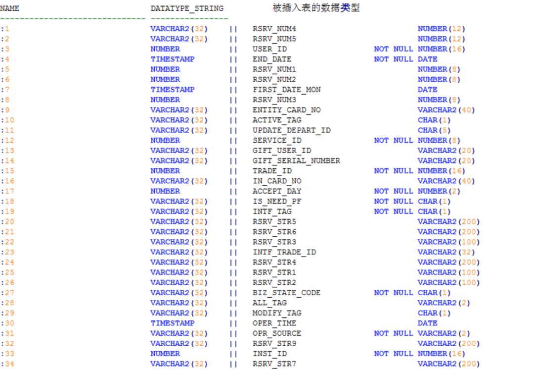 左边为绑定变量的数据类型,右边为对应表字段数据类型,通过对比发现,几乎没有完全与之匹配的数据类型,也验证了子游标没有被共享的原因:绑定变量类型和绑定变量类型的长度发生了变化。