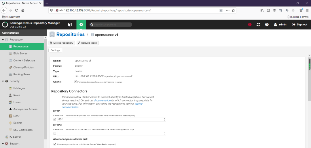 如上图所示,opensource-v1为创建的Docker仓库项目(基于hosted类型),在此基础上我们对该项目进行配置管理,主要涉及到仓库端口,api版本允许,匿名提交权限,仓库存储位置,仓库权限等。其中还涉及到规则配置,是Nexus安全性管理中重要的一项。