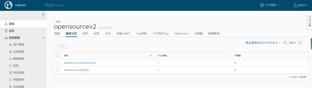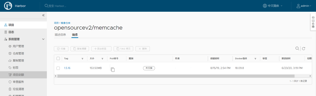 如上图所示,memcache镜像为测试上传push到Harbor仓库中的展示,其页面内容描述了当前镜像的详细信息,镜像具有复制,添加标签,tag复制及删除功能。