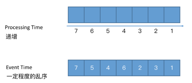 Event time: 数据上自带的时间,可理解为数据世界的时间。实际场景中应用较多,由于数据在传输过程有网络、I/O以及消费等因素,往往不能保证数据按顺序到达,因此导致了时间的乱序等问题。