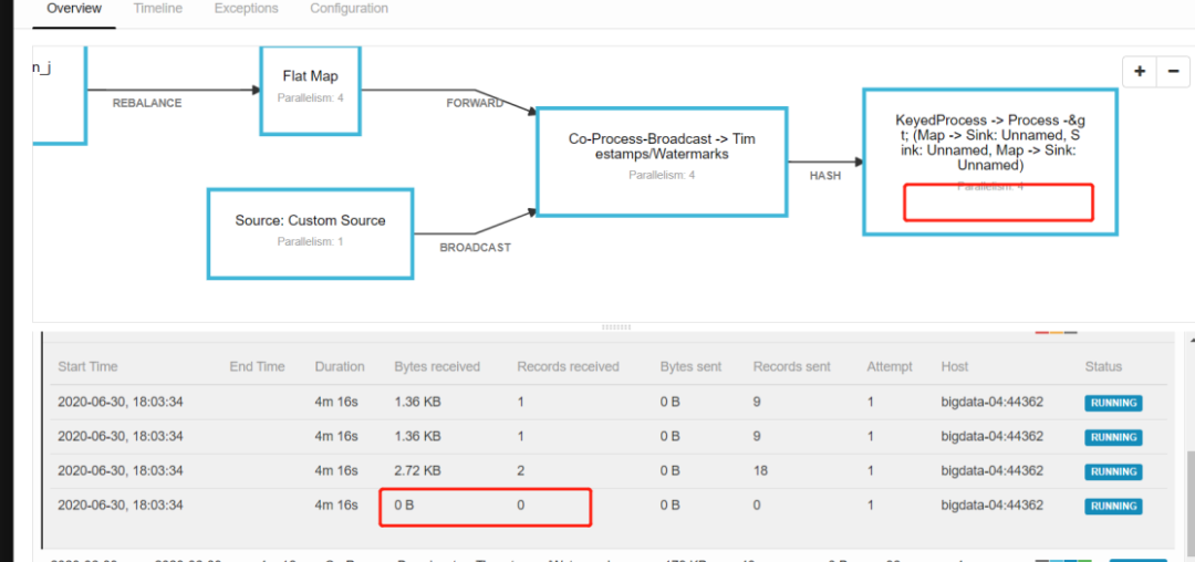 原因:通过前台对flink任务的监控发现,4个并行后由于数据量太少,有一个并行没有收到数据,因此没有产生Watermaker,由Watermaker的特性的第三条可以理解,整个程序目前的watermarker取的是第4个并行的watermarker初始值Long.MIN_VALUE,所以导致整个程序没有进行触发汇总。