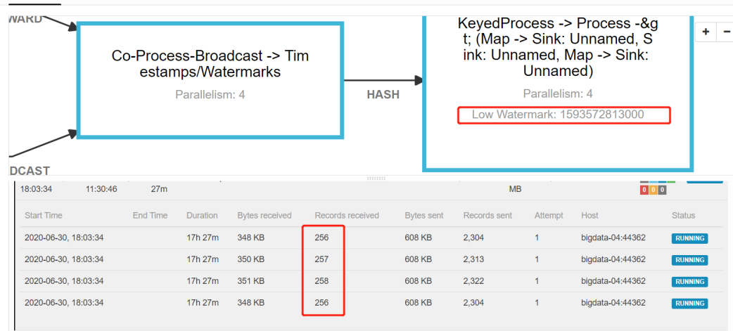 业务链处理经过算子处理之后m条数据会生成m*n条数据,然后进行keyby汇总。之前水位注册在汇总数据之前,因此需要对m*n条数据都进行水位注册,使得同一时间多次水位处理,程序效率也下来了,整个任务吞吐量变低。利用水位广播传递的特点,将水位注册放到数据源,只需要对m条数据进行注册,处理逻辑直接少了n倍,整个任务吞吐量也随之上来了