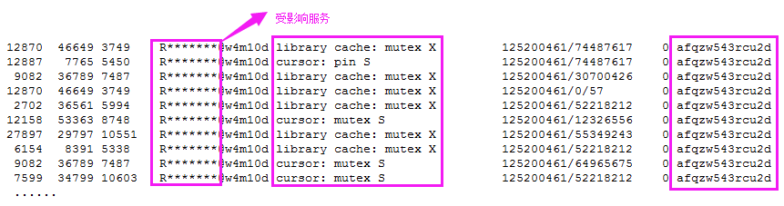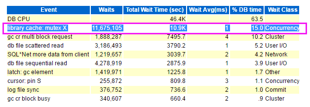 于是马上接入CRM库进行分析,跟踪积压服务在数据库执行情况。通过剖析主要发现该服务发起的session存在大量的librarycache: mutex X争用,且都在特定的sql上(sql_id:afqzw543rcu2d)。