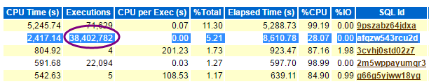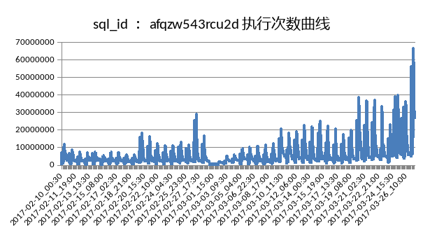 分析发现2月11日6点到9点30分总执行次数只有5000万次左右,3月20日6点到9点30分总共执行了1.1亿次,3月27日,6点到9点30分,总共执行了4.01亿次,差不多增长了4倍。所以从数据上分析,该SQL的执行次数是一个不断增长的趋势;