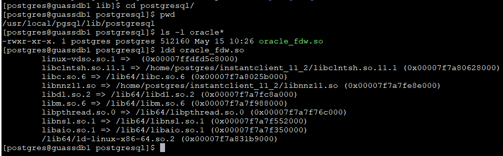 create extension oracle_fdw; postgres=# \dx List of installed extensions Name | Version | Schema | Description ------------+---------+------------+---------------------------------------- oracle_fdw | 1.1 | public | foreign data wrapper for Oracle access -->说明创建成功 plpgsql | 1.0 | pg_catalog | PL/pgSQL procedural language |