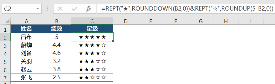 =REPT("★",ROUNDDOWN(B2,0))&REPT("☆",ROUNDUP(5-B2,0))