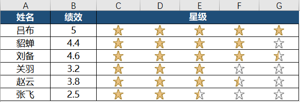 最后我们将C2只G2的公式向下应用,就可以得到一个比较美观的星级评价表了。