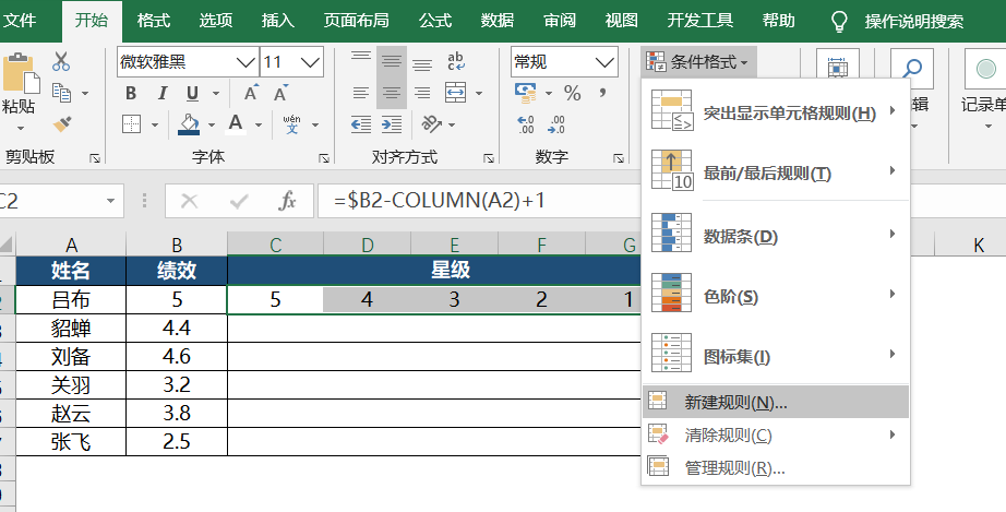 选中单元格C2至G2,然后点击菜单栏的条件格式——新建规则,如下图: