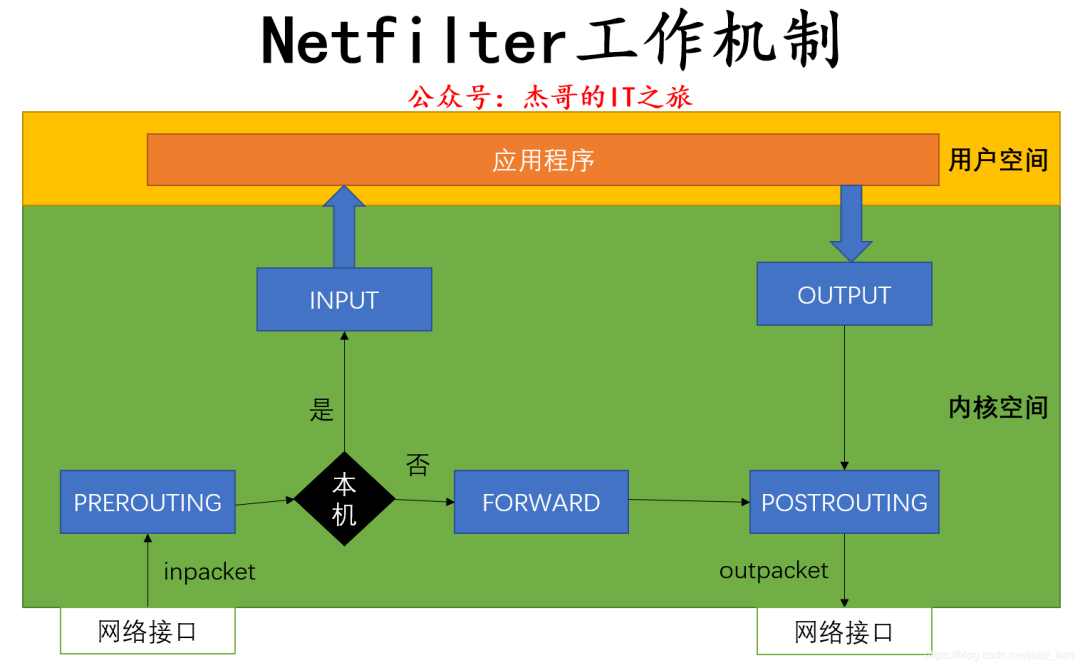 iptable 是用户层的工具,提供命令行接口,能够向 Netfilter 中添加规则策略,从而实现报文过滤,修改等功能。通过下图我们可以来了解下 Netfilter 的工作机制: