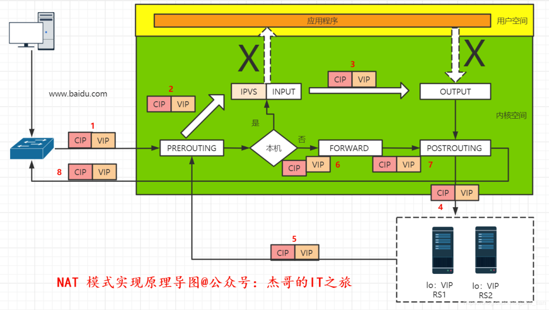 ①客户端发出的请求数据包经过网络到达 LVS 网卡,数据包源 IP 为 CIP,目的 IP 为 VIP。②然后进入 PREROUTING 链中,根据目的 IP 查找路由,确定是否为本机 IP 地址,随后将数据包转发至 INPUT 链中,源 IP 和 目的 IP 不变。③到达 LVS 后,通过目的 IP 和目的 PORT 查找是否为 IPVS 服务,如是 IPVS 服务,将会选择一个 RS 来作为后端服务器,数据包的目的 IP 地址将会修改为 RIP,这时并以 RIP 为目的 IP 去查找路由,确定下一跳及 PORT 信息后,数据包将会转发至 OUTPUT 链中。④被修改过的数据包经过 POSTROUTING 链后,到达 RS 服务器,数据包源 IP 为 CIP,目的 IP 为 RIP。⑤RS 服务器经过处理后,将会把数据包发送至用户空间的应用程序,待处理完成后,发送响应数据包,RS 服务器的默认网关为 LVS 的 IP,应用程序将会把数据包转发至下一跳 LVS 服务器,数据包源 IP 为 RIP,目的 IP 为 CIP。⑥LVS 服务器收到 RS 服务器响应的数据包后,查找路由,目的 IP 不是本机 IP并且 LVS 服务器开启了 FORWARD 模式,会将数据包转发给它,数据包不变。⑦LVS 服务器收到响应数据包后,根据目的 IP 和 目的 PORT 查找相应的服务,这时,源 IP 为 VIP,通过查找路由,确定下一跳信息并将数据包发送至网关,最终回应给客户端用户。RS 服务器需配置网关。