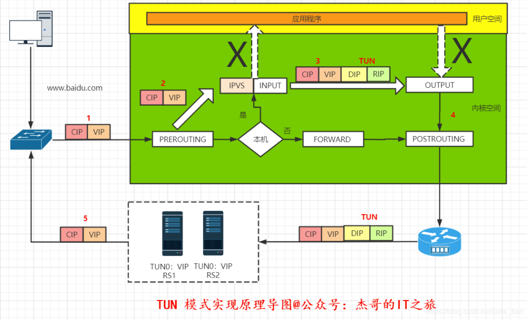 ①客户端发送数据包经过网络后到 LVS 网卡,数据包源 IP 为 CIP,目的 IP 为 VIP。②进入 PREROUTING 链后,会根据目的 IP 去查找路由,确定是否为本机 IP,数据包将转发至 INPUT 链中,到 LVS,源 IP 和 目的 IP 不变。③到 LVS 后,通过目的 IP 和目的 PORT 查找是否为 IPVS 服务,如是 IPVS 服务,将会选择一个 RS 后端服务器, 源 IP 为 DIP,目标 IP 为 RIP,数据包将会转发至 OUTPUT 链中。④数据包根据路由信息到达 LVS 网卡,发送至路由器网关,最终到达后端服务器。⑤后端服务器收到数据包后,会拆掉最外层的 IP 地址后,会发现还有一层 IP 首部,源 IP 为 CIP,目的 IP 为 VIP,TUNL0 上配置 VIP,查找路由后判断为本机 IP 地址,将会发给用户空间层的应用程序响应后 VIP 为源 IP,CIP 为目的 IP 数据包发送至网卡,最终返回至客户端用户。单臂模式,LVS 负载压力小。