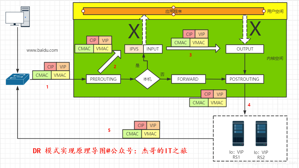 ①当客户端用户发送请求给 www.baidu.com 网站时,首先经过 DNS 解析到 IP 后并向百度服务器发送请求,数据包经过网络到百度 LVS 负载均衡服务器。这时到达 LVS 网卡时的数据包包括:源 IP 地址(客户端地址)、目的 IP 地址(百度对外服务器 IP 地址,也就是 VIP)、源 MAC 地址(CMAC LVS 连接路由器的 MAC 地址)、目标 MAC 地址(VMAC VIP 对应的 MAC 地址)。②数据包到达网卡后,经过链路层到达 PREROUTING 链,进行查找路由,发现目的 IP 是 LVS 的 VIP,这时就会发送至 INPUT 链中并且数据包的 IP 地址、MAC 地址、Port 都未经过修改。③数据包到达 INPUT 链中,LVS 会根据目的 IP 和 Port(端口)确认是否为 LVS 定义的服务。如是定义过的 VIP 服务,会根据配置的服务信息,从 RealServer 中选择一个后端服务器 RS1,然后 RS1 作为目标出方向的路由,确定下一跳信息及数据包通过具体的哪个网卡发出,最好将数据包通过 INET_HOOK 到 OUTPUT 链中。④数据包通过 POSTROUTING 链后,目的 MAC 地址将会修改为 RealServer 服务器 MAC 地址(RMAC)源 MAC 地址修改为 LVS 与 RS 同网段的 IP 地址的 MAC 地址(DMAC)此时,数据包将会发至 RealServer 服务器。⑤数据包到达 RealServer 服务器后,发现请求报文的 MAC 地址是自己的网卡 MAC 地址,将会接受此报文,待处理完成之后,将响应报文通过 lo 接口传送给 eth0 网卡然后向外发出。此时的源 IP 地址为 VIP,目标 IP 为 CIP,源 MAC 地址为 RS1 的 RMAC,目的 MAC 地址为下一跳路由器的 MAC 地址(CMAC),最终数据包通过 RS 相连的路由器转发给客户端。响应数据不经过 LVS,性能高。