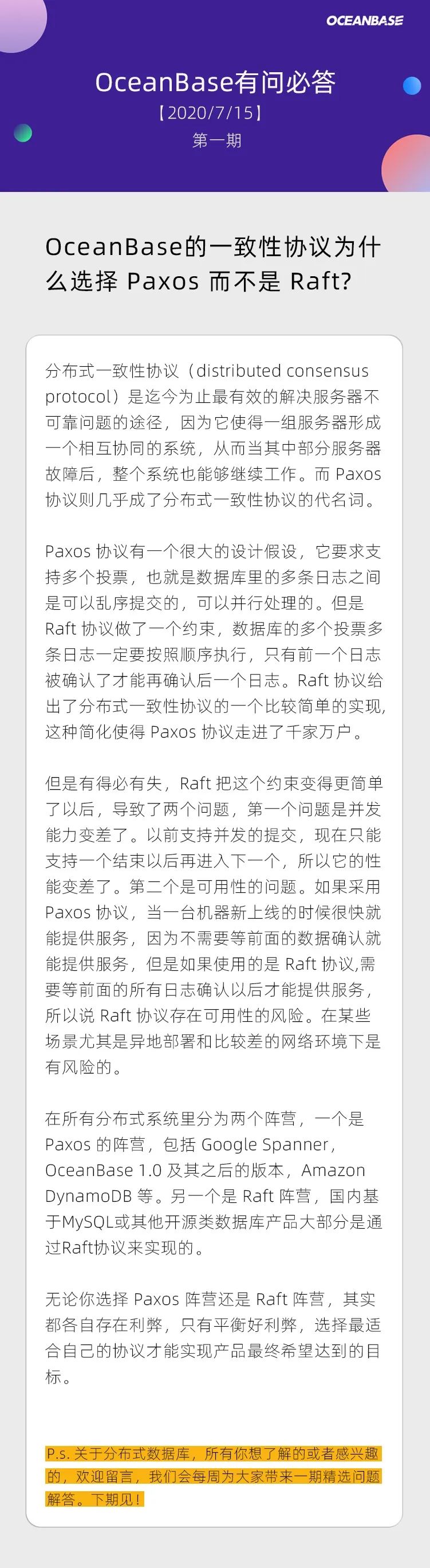 OB君:“OB有问必答”是OceanBase最新上线的互动类栏目,每周围绕一个关于分布式数据库的议题为大家详细展开解答,如果你有任何感兴趣的问题,欢迎留言,我们会每周选取一个问题为大家详细解答。