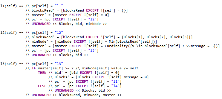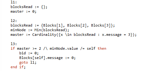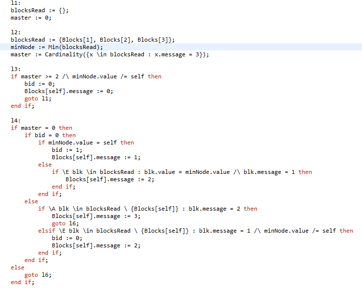 PlusCal是基于TLA+的用于描述算法的语言,语言特别支持了并发和分布式系统中的语义支持,并且支持将描述转译成TLA+并使用TLA+的模型验证。PlusCal的形式更贴近程序语言(虽然还不完全一样,例如描述遍历除了本进程对应的blocksRead,是否全部其他进程对应的blocksRead中message都是2的形式是:\A blk \in blocksRead \ {Blocks[self]} : blk.message = 2),更适合程序员来使用。