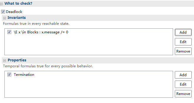在对系统做了建模描述后(TLA+里的specification)可以通过创建model(可以理解为一个specification的一个实例,包含对specification中CONSTANT的初始赋值和behavior的指定)完成对系统的验证,model在运行过程中可以完成指定的check,如下图,设置了死锁检测、全部状态中的表达式检测、是否在全部情况下spec都会会终止。