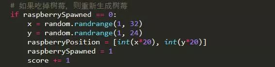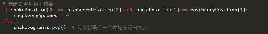 如果蛇头与树莓的方块重合,则判定吃到树莓,将树莓数量清零;而没吃到树莓的话,蛇身就会跟着蛇头运动,蛇身的最后一节将被踢出列表。