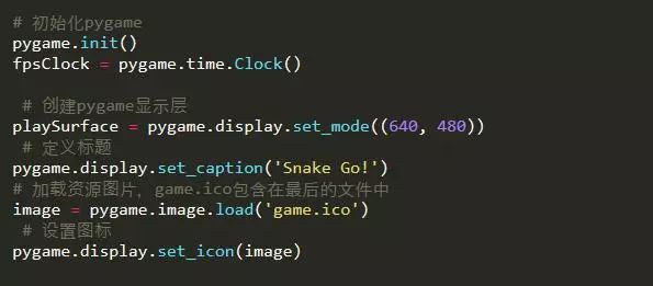 我们通过这几行代码来初始化pygame,定义窗口(边界)的大小,窗口的标题和图标。