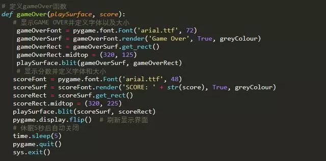 之前提到,所有游戏最重要的部分是循环。而GameOver函数就是跳出这个循环的条件。这里给出当蛇吃到自己身体或者碰到边界时显示的界面(判断死亡的代码会在之后展示)