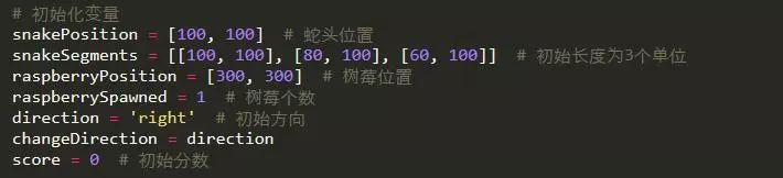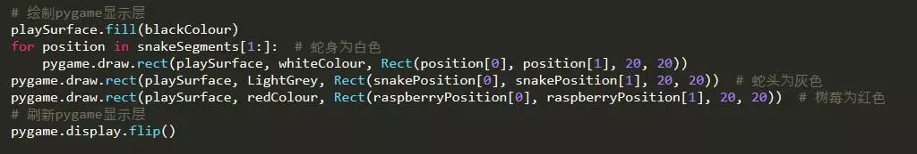 接下来介绍游戏的主题部分,即贪吃蛇与蛇莓的显示以及运动。我们将整个界面看成许多20*20的小方块,每个方块代表一个单位,蛇的长度就可以用几个单位表示啦。这里蛇的身体用列表的形式存储,方便之后的删减。