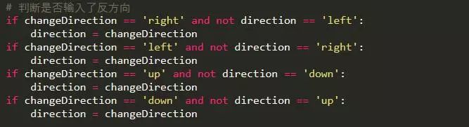 贪吃蛇运动有一个特点:不能反方向运动。所以我们需要加入限制条件。