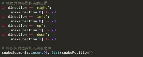 接下来就是将蛇头按照键盘的输入进行转弯操作,并将蛇头当前的位置加入到蛇身的列表中。