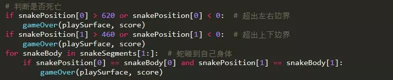当蛇头超出边界或者蛇头与自己的蛇身重合时,蛇类死亡,调用GameOver。