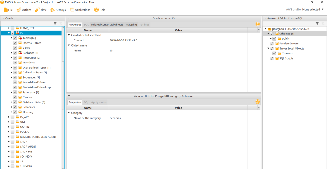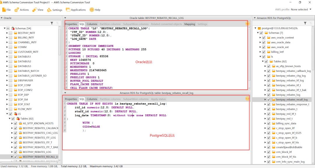 元数据迁移完成之后,即可对数据进行迁移工作了。元数据迁移需要注意不要导入索引和约束、触发器。进行数据迁移,包括全量迁移时,可以使用AWSSchema Conversion Tool或者ora2PG工具。