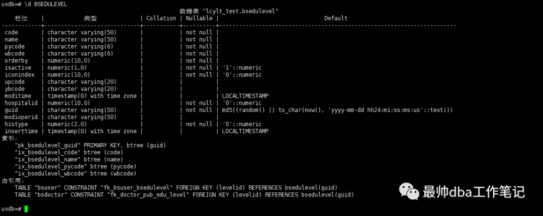 栏位 | 类型 | Collation | Nullable | Default-----------------------+-----------------------------+-----------+----------+------------------------------------------------------------------------code | character varying(50) | | not null |name | character varying(30) | | not null |password | character varying(300) | | not null |isactive | numeric(1,0) | | not null | 1reason | character varying(12) | | |lsinputway | numeric(10,0) | | not null | 1iconindex | numeric(10,0) | | not null | 0isuserinputwb | numeric(1,0) | | | 0isuserinputpy | numeric(1,0) | | | 0isuserinputcode | numeric(1,0) | | | 0isuserinputname | numeric(1,0) | | | 0isuserinputstrokecode | numeric(1,0) | | | 0isuserinputengdesc | numeric(1,0) | | | 0picturepath | character varying(200) | | | ' '::character varyingaddress | character varying(40) | | |mobile | character varying(30) | | |hospitalid | numeric(10,0) | | not null | '0'::numericcaregroupid1 | numeric(10,0) | | |certidno | character varying(100) | | |pycode | character varying(30) | | |wbcode | character varying(30) | | |isuserinputf1 | numeric(1,0) | | not null |isuserinputlist | numeric(1,0) | | not null |isuserwordpad | numeric(1,0) | | not null |isuserselectonly | numeric(1,0) | | not null |isgiveredenvelopes | numeric(1,0) | | | '1'::numericremark | character varying(200) | | |isinternalstaff | numeric(1,0) | | | '1'::numericdeduct | numeric(10,2) | | |lsstatus | numeric(3,0) | | |email | character varying(50) | | |birthdate | timestamp(0) with time zone | | |sex | character(1) | | |moditime | timestamp(0) with time zone | | | LOCALTIMESTAMPopertime | timestamp(0) with time zone | | | LOCALTIMESTAMPisintegralstaff | numeric(1,0) | | |iscancancel | numeric(10,0) | | |isvolunteer | numeric(1,0) | | |isrecipe | numeric(1,0) | | |guid | character varying(50) | | not null | md5((random() || to_char(now(), 'yyyy-mm-dd hh24:mi:ss:ms:us'::text)))doclevid | character varying(50) | | |caregroupid | character varying(50) | | |levelid | character varying(50) | | |departmentid | character varying(50) | | |diagroomid | character varying(50) | | |modioperid | character varying(50) | | |roleid | character varying(50) | | |locationid | character varying(50) | | |isitanexpert | numeric(1,0) | | |histype | numeric(2,0) | | not null | '0'::numericintroduce | character varying(1000) | | |teamid | character varying(50) | | |doclevname | character varying(50) | | |departmentname | character varying(50) | | |ruleid | character varying(150) | | |ybcode | character varying(50) | | |wechatid | character varying(50) | | |school | character varying(50) | | |major | character varying(50) | | |bankaccount | character varying(100) | | |salary | numeric(18,4) | | |qq | character varying(50) | | |wechat | character varying(50) | | |native | character varying(100) | | |linkmanname | character varying(10) | | |familyground | character varying(100) | | |doccertifycode | character varying(100) | | |provinceid | character varying(50) | | |索引:"pk_bsuser_guid" PRIMARY KEY, btree (guid)"ix_bsuser_caregroupid" btree (caregroupid)"ix_bsuser_code" btree (code)"ix_bsuser_doclevid" btree (doclevid)"ix_bsuser_levelid" btree (levelid)"ix_bsuser_name" btree (name)"ix_bsuser_wechatid" btree (wechatid)外部键(FK)限制:"fk_bsuser_bscaregroup" FOREIGN KEY (caregroupid) REFERENCES bscaregroup(guid)"fk_bsuser_bsdoclevel" FOREIGN KEY (doclevid) REFERENCES bsdoclevel(guid)"fk_bsuser_bsedulevel" FOREIGN KEY (levelid) REFERENCES bsedulevel(guid)"fk_bsuser_wechatid" FOREIGN KEY (wechatid) REFERENCES weichat_user(guid)由引用:TABLE "additionalmeal" CONSTRAINT "fk_additionalmeal_adduser" FOREIGN KEY (adduser) REFERENCES bsuser(guid)TABLE "additionalmeal" CONSTRAINT "fk_additionalmeal_auditor" FOREIGN KEY (auditor) REFERENCES bsuser(guid)TABLE "additionalmeal" CONSTRAINT "fk_additionalmeal_canceller" FOREIGN KEY (canceller) REFERENCES bsuser(guid)TABLE "additionalmeal" CONSTRAINT "fk_additionalmeal_updtuser" FOREIGN KEY (updtuser) REFERENCES bsuser(guid)TABLE "additionfee" CONSTRAINT "fk_additionfee_operid" FOREIGN KEY (operid) REFERENCES bsuser(guid)TABLE "additionfee" CONSTRAINT "fk_additionfee_signoperid" FOREIGN KEY (signoperid) REFERENCES bsuser(guid)TABLE "bsdoctor" CONSTRAINT "fk_bsdoctor_userid" FOREIGN KEY (userid) REFERENCES bsuser(guid)TABLE "bseqmaintain" CONSTRAINT "fk_bseqmaintain_operid" FOREIGN KEY (operid) REFERENCES bsuser(guid)TABLE "bshrdegree" CONSTRAINT "fk_bshrdegree_operid" FOREIGN KEY (operid) REFERENCES bsuser(guid)TABLE "bsitem" CONSTRAINT "fk_bsitem_bsuser" FOREIGN KEY (operid) REFERENCES bsuser(guid)TABLE "bssigningdoctor_iywt" CONSTRAINT "fk_bssigningdoctor_doctorid" FOREIGN KEY (doctorid) REFERENCES bsuser(guid)TABLE "bsbed" CONSTRAINT "fk_bsuser_bsbed" FOREIGN KEY (operid) REFERENCES bsuser(guid)TABLE "bsitembpid" CONSTRAINT "fk_bsuser_bsitembpid" FOREIGN KEY (userid) REFERENCES bsuser(guid)TABLE "inhosinfo" CONSTRAINT "fk_bsuser_inhosinfo" FOREIGN KEY (operid) REFERENCES bsuser(guid)TABLE "inhosinfo" CONSTRAINT "fk_bsuser_inhosinfo2" FOREIGN KEY (endchgoperid) REFERENCES bsuser(guid)TABLE "ckitem" CONSTRAINT "fk_ckitem_bsuser" FOREIGN KEY (operid) REFERENCES bsuser(guid)TABLE "colinkmanchange" CONSTRAINT "fk_colinkmanchange_auditoperid" FOREIGN KEY (auditoperid) REFERENCES bsuser(guid)TABLE "colinkmanchange" CONSTRAINT "fk_colinkmanchange_mealoperid" FOREIGN KEY (mealoperid) REFERENCES bsuser(guid)TABLE "colinkmanchange" CONSTRAINT "fk_colinkmanchange_operid" FOREIGN KEY (operid) REFERENCES bsuser(guid)TABLE "copatientfixedcost" CONSTRAINT "fk_copatientfixedcost_lastchar" FOREIGN KEY (lastchargeoperid) REFERENCES bsuser(guid)TABLE "copatientfixedcost" CONSTRAINT "fk_copatientfixedcost_operid" FOREIGN KEY (operid) REFERENCES bsuser(guid)TABLE "copatientfixedcost" CONSTRAINT "fk_copatientfixedcost_stopchar" FOREIGN KEY (stopchargeoperid) REFERENCES bsuser(guid)TABLE "copatientprimecost" CONSTRAINT "fk_copatientprimecost_cancelid" FOREIGN KEY (cancelid) REFERENCES bsuser(guid)TABLE 