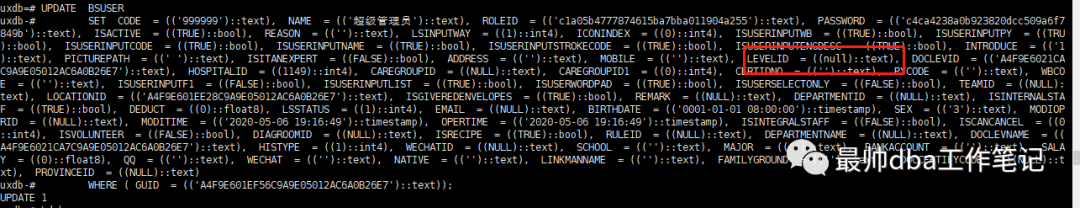 UPDATE BSUSERSET CODE = (('999999') ::text),NAME = (('超级管理员') ::text),ROLEID = (('c1a05b4777874615ba7bba011904a255') ::text),PASSWORD = (('c4ca4238a0b923820dcc509a6f75849b') ::text),ISACTIVE = ((TRUE) ::bool),REASON = (('') ::text),LSINPUTWAY = ((1) ::int4),ICONINDEX = ((0) ::int4),ISUSERINPUTWB = ((TRUE) ::bool),ISUSERINPUTPY = ((TRUE) ::bool),ISUSERINPUTCODE = ((TRUE) ::bool),ISUSERINPUTNAME = ((TRUE) ::bool),ISUSERINPUTSTROKECODE = ((TRUE) ::bool),ISUSERINPUTENGDESC = ((TRUE) ::bool),INTRODUCE = (('1') ::text),PICTUREPATH = ((' ') ::text),ISITANEXPERT = ((FALSE) ::bool),ADDRESS = (('') ::text),MOBILE = (('') ::text),LEVELID = ((null) ::text),DOCLEVID = (('A4F9E6021CA7C9A9E05012AC6A0B26E7') ::text),HOSPITALID = ((1149) ::int4),CAREGROUPID = ((NULL) ::text),CAREGROUPID1 = ((0) ::int4),CERTIDNO = (('') ::text),PYCODE = (('') ::text),WBCODE = (('') ::text),ISUSERINPUTF1 = ((FALSE) ::bool),ISUSERINPUTLIST = ((TRUE) ::bool),ISUSERWORDPAD = ((TRUE) ::bool),ISUSERSELECTONLY = ((FALSE) ::bool),TEAMID = ((NULL) ::text),LOCATIONID = (('A4F9E601EE28C9A9E05012AC6A0B26E7') ::text),ISGIVEREDENVELOPES = ((TRUE) ::bool),REMARK = ((NULL) ::text),DEPARTMENTID = ((NULL) ::text),ISINTERNALSTAFF = ((TRUE) ::bool),DEDUCT = ((0) ::float8),LSSTATUS = ((1) ::int4),EMAIL = ((NULL) ::text),BIRTHDATE = (('0001-01-01 08:00:00') ::timestamp),SEX = (('3') ::text),MODIOPERID = ((NULL) ::text),MODITIME = (('2020-05-06 19:16:49') ::timestamp),OPERTIME = (('2020-05-06 19:16:49') ::timestamp),ISINTEGRALSTAFF = ((FALSE) ::bool),ISCANCANCEL = ((0) ::int4),ISVOLUNTEER = ((FALSE) ::bool),DIAGROOMID = ((NULL) ::text),ISRECIPE = ((TRUE) ::bool),RULEID = ((NULL) ::text),DEPARTMENTNAME = ((NULL) ::text),DOCLEVNAME = (('A4F9E6021CA7C9A9E05012AC6A0B26E7') ::text),HISTYPE = ((1) ::int4),WECHATID = ((NULL) ::text),SCHOOL = (('') ::text),MAJOR = (('') ::text),BANKACCOUNT = (('') ::text),SALARY = ((0) ::float8),QQ = (('') ::text),WECHAT = (('') ::text),NATIVE = (('') ::text),LINKMANNAME = (('') ::text),FAMILYGROUND = (('') ::text),DOCCERTIFYCODE = ((NULL) ::text),PROVINCEID = ((NULL) ::text)WHERE (GUID = (('A4F9E601EF56C9A9E05012AC6A0B26E7') ::text))