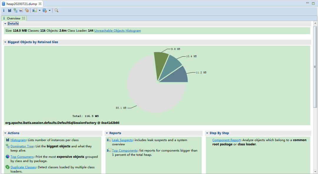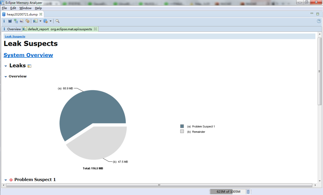 例如,可以看下可能的泄露问题,点击饼图部分,就可以看到构成此问题的具体类,因为涉及细节,在此不做展示,