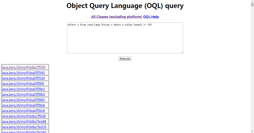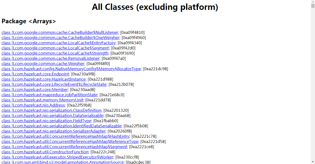 [test@localhost]> jhat -port 9999 heap20200721.dumpReading from heap20200721.dump...Dump file created Tue Jul 21 11:27:12 CST 2020Snapshot read, resolving...Resolving 5995070 objects...WARNING: Failed to resolve object id 0xe2db5378 for field annotations (signature L)...(省略)WARNING: Failed to resolve object id 0xe195ce40 for field annotationDefault (signature L)Chasing references, expect 1199 dots.............................................................................................................................Eliminating duplicate references.............................................................................................................................Snapshot resolved.Started HTTP server on port 9999Server is ready.