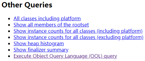 其实,除了MAT,还有其他能看dump文件的工具,例如jdk自带的jhat,他可以分析堆,并将堆中对象以html的形式显示出来,支持对象查询语言OQL,操作更加粗暴,参数就是任意可用的端口和dump文件名,